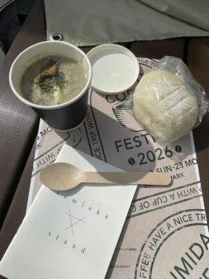 「ごぼうと舞茸の豆乳ポタージュ」と「白パン」をいただきました(#^^#)
