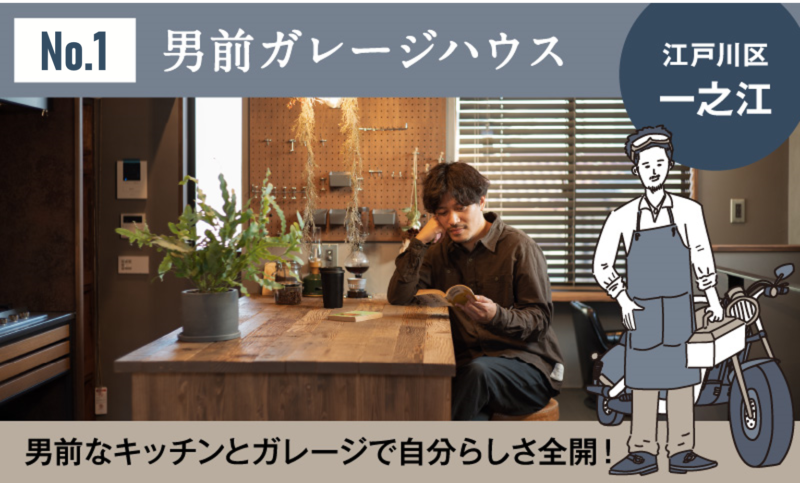 電動シャッター付きのガレージで、バイクや自転車の整備に没頭できる1棟。 |