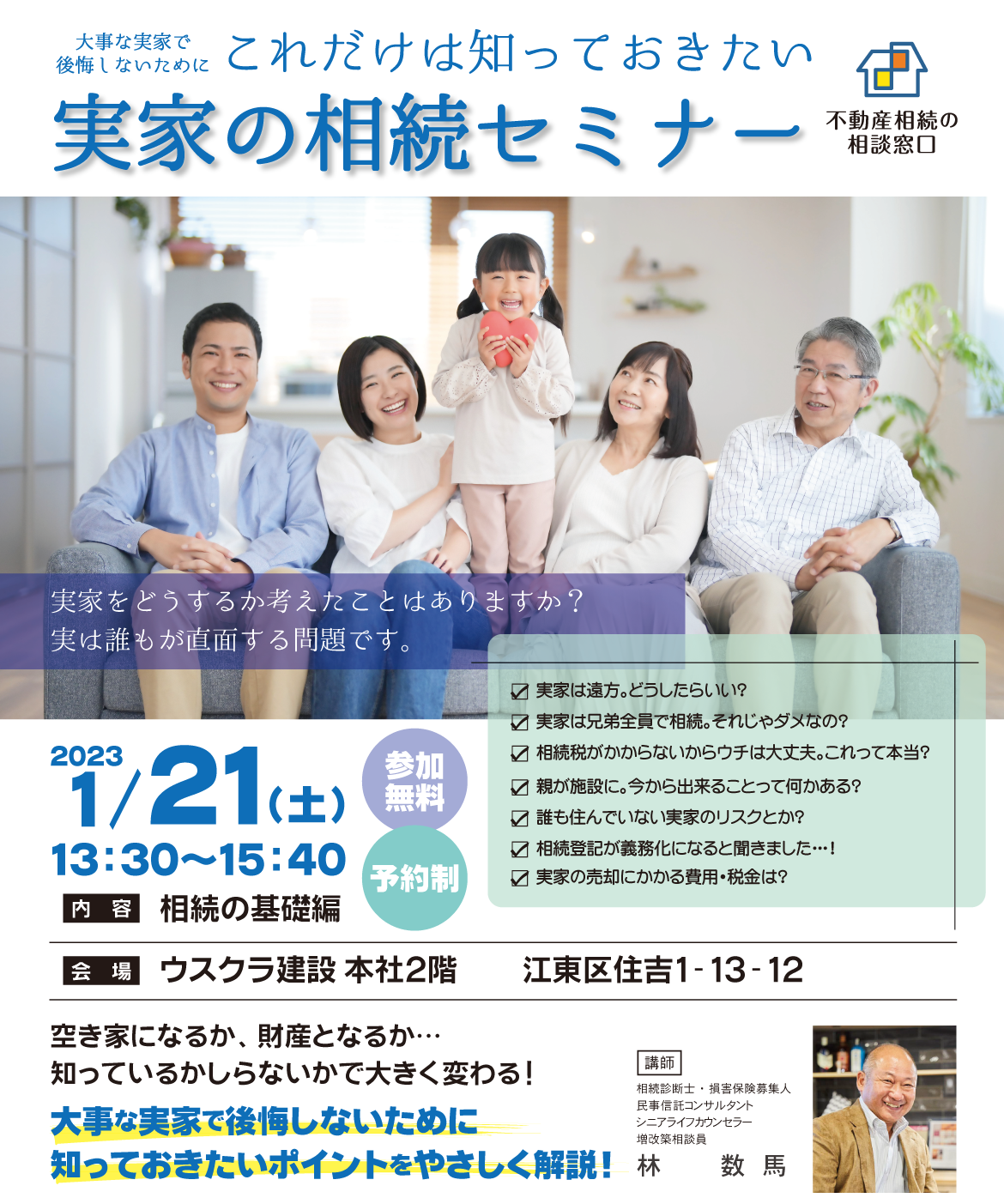 【終了しました】1月21日(土)に【実家の相続セミナー】を開催いたします このイベントは終了しました。 ありがとうございました。 チラシデータ(PDF版) 関連投稿: 【終了しました】5月20日(土)に【実家の相続セミナー】を開催いたします 【終了しました】6月17日(土)に【実家の相続セミナー】を開催いたします 【終了しました】1月13日(土)に【実家の相続セミナー】を開催いたします 【終了しました】2月24日(土)に【実家の相続セミナー】を開催いたします 弊社