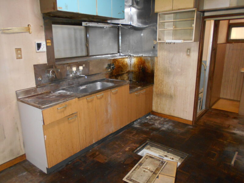 1階のキッチンは真っ暗!雨漏りの跡もあり、間取りは細切れの4SLDKって感じで・・・