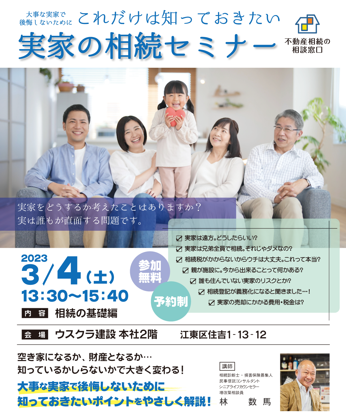 【終了いたしました】3月4日(土)に【実家の相続セミナー】を開催いたします このイベントは終了しました。 ありがとうございました。 チラシデータ(PDF版) 関連投稿: 【終了しました】2月18日(土)に【実家の相続セミナー】を開催いたします 【終了しました】6月17日(土)に【実家の相続セミナー】を開催いたします 【終了しました】1月13日(土)に【実家の相続セミナー】を開催いたします 【終了しました】2月24日(土)に【実家の相続セミナー】を開催いたします 弊社
