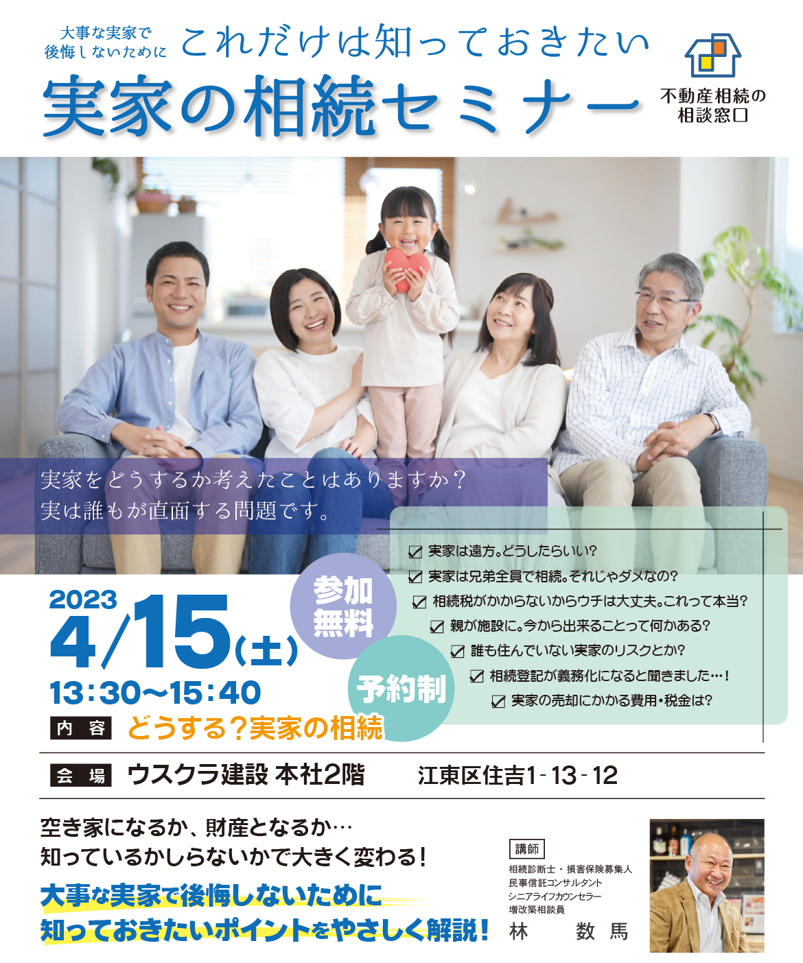 【終了しました】4月15日(土)に【実家の相続セミナー】を開催いたします このイベントは終了しました。 ありがとうございました。 チラシデータ(PDF版) 関連投稿: 【終了しました】2月18日(土)に【実家の相続セミナー】を開催いたします 【終了しました】6月17日(土)に【実家の相続セミナー】を開催いたします 【終了しました】1月13日(土)に【実家の相続セミナー】を開催いたします 【終了しました】2月24日(土)に【実家の相続セミナー】を開催いたします 弊社