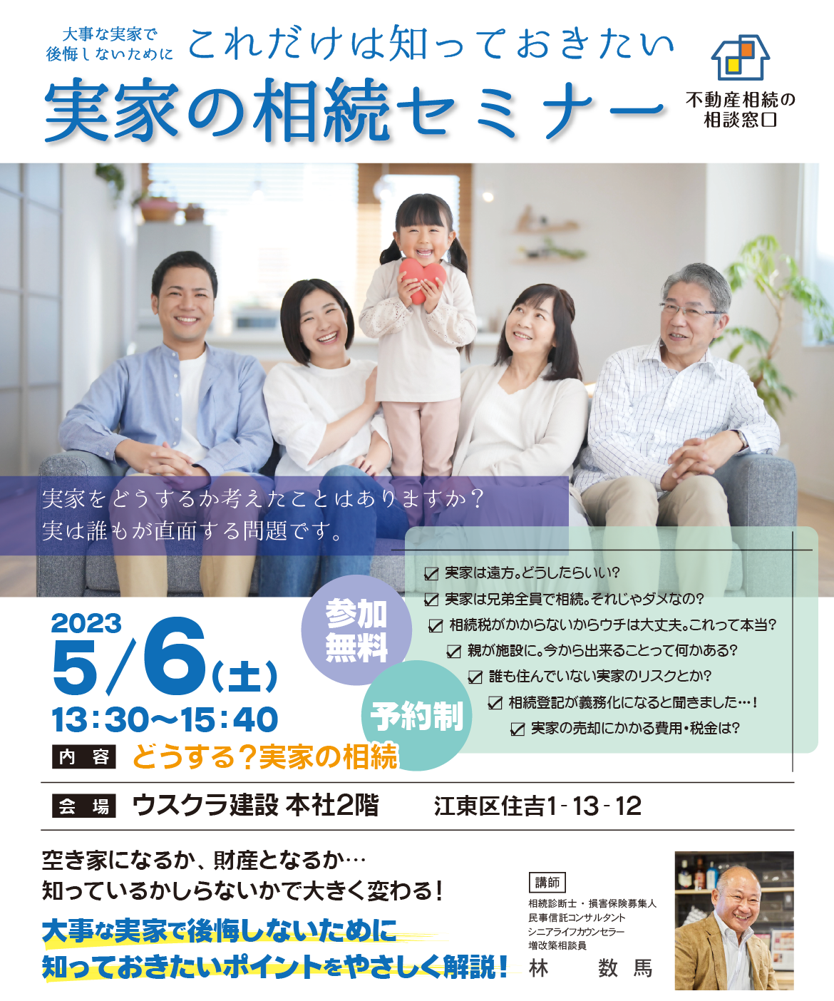 【終了しました】5月6日(土)に【実家の相続セミナー】を開催いたします このイベントは終了しました。 ありがとうございました。 チラシデータ(PDF版) 関連投稿: 【終了しました】2月18日(土)に【実家の相続セミナー】を開催いたします 【終了しました】6月17日(土)に【実家の相続セミナー】を開催いたします 【終了しました】1月13日(土)に【実家の相続セミナー】を開催いたします 【終了しました】2月24日(土)に【実家の相続セミナー】を開催いたします 弊社