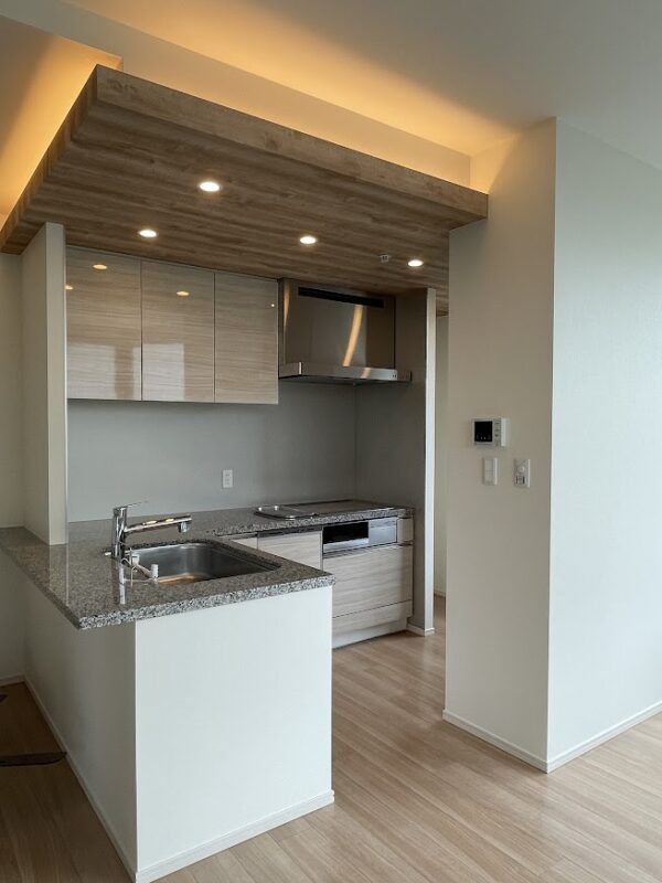 天井部分の造作、ライン照明の設置、木目のクロスを天井部分に貼ることで・・・こんな風に生まれ変わりました!!