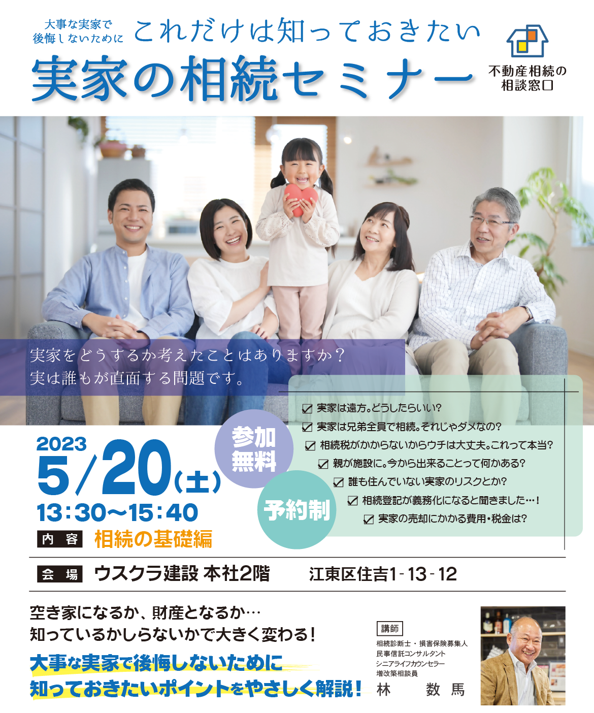 このイベントは終了しました。 ありがとうございました。 チラシデータ(PDF版) 関連投稿: 【終了しました】2月18日(土)に【実家の相続セミナー】を開催いたします 【終了しました】6月17日(土)に【実家の相続セミナー】を開催いたします 【終了しました】1月13日(土)に【実家の相続セミナー】を開催いたします 【終了しました】2月24日(土)に【実家の相続セミナー】を開催いたします 弊社