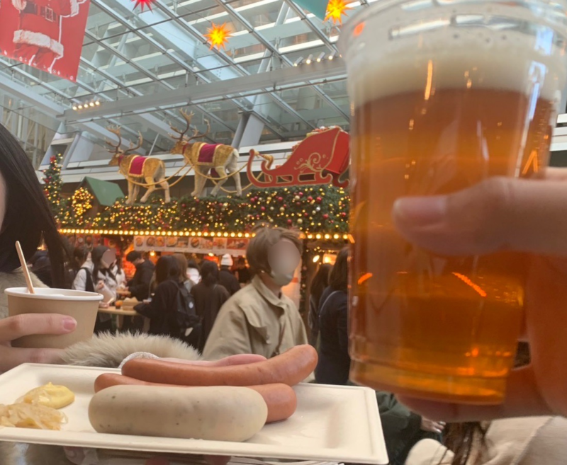 全体を一周回って見てからとりあえずビールとソーセージを買いました!