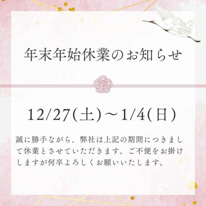 平素は格別のお引き立てを賜り厚く御礼申し上げます。 2025年12月27日(土)~2025年1月4日(日)まで 上記の期間休業とさせていただきます。 ご不便をお掛けしますが、何卒ご了承の程お願い申し上げます。 1月5日( […]