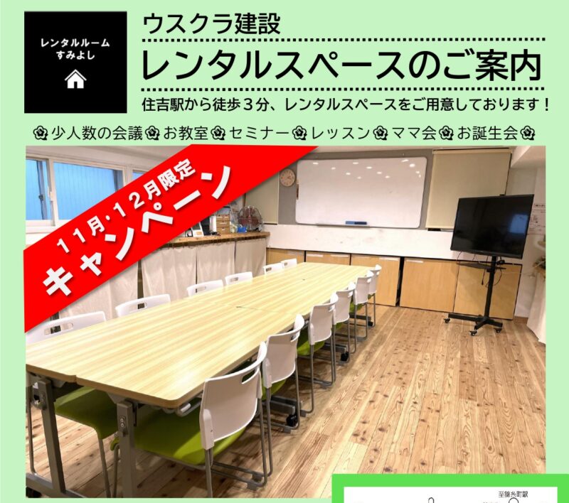 ウスクラ建設の時間貸しスペース「レンタルルームすみよし」では 11月・12月限定でお得なキャンペーンを実施中!! *維持管理費 通常500円のところ、今なら「0円」 *レンタル料金 平日通常600円のところ、今なら「50 […]