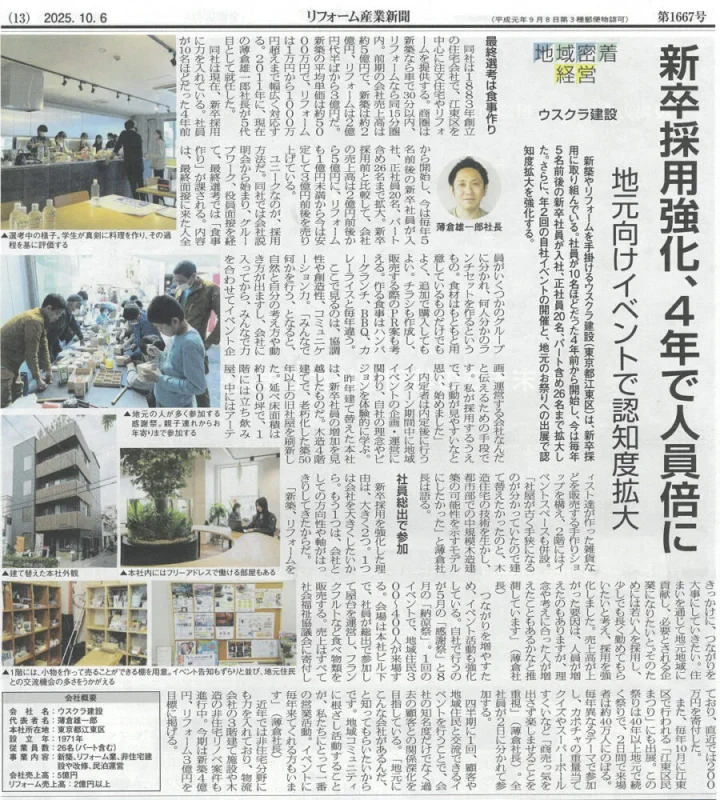 10月6日発行の業界紙 【リフォーム産業新聞】に弊社を取り上げて頂きました。 軽く取材を受けたつもりだったんですが、想像以上にデカい記事になっていてビックリしました でも発行する前に校正したかった… &nb […]
