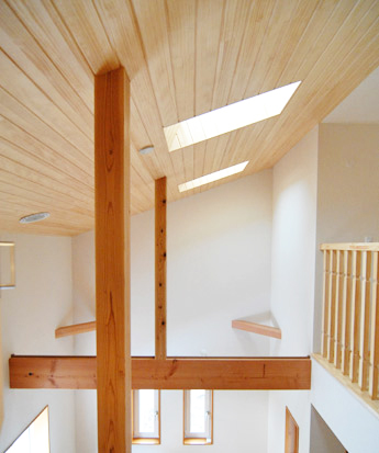 2Fホールの奥の吹き抜けは、1Fのリビングへ繋がっています。大空間でも暖かなのは、外断熱の家ならでは。