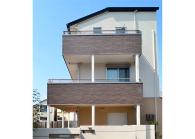 2種類のサイディングと、塗壁の切り替えが素敵な外観。
