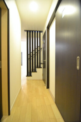 玄関から。階段にはガラリを設けてプライバシーにも配慮しました。