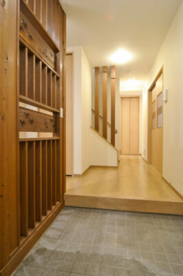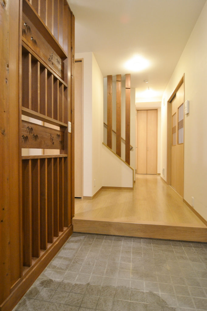 玄関土間にあるシューズクロークはひいおばあちゃんの欄間を使用しました。