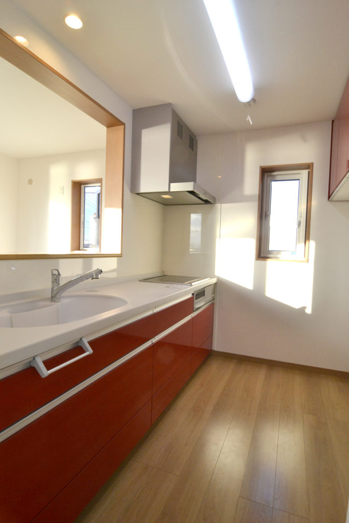 渋いエンジカラーがアクセントの広々としたキッチンです。
