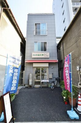 路から少し奥に入った建物。1Fは文具店、2・3Fは住居になっています。