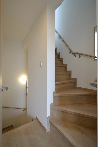 照明と窓から柔らかな光が入る階段は2・3階の住居部分につながります。2F キッチン