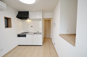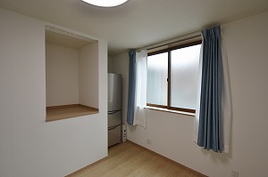 壁面には冷蔵庫がスッポリと入るスペース、収納部分も確保。