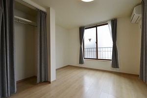 収納と窓のカーテンはお揃いで、落ち着いたカラーが素敵です。