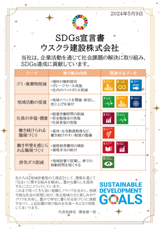 ウスクラ建築株式会社は、SDGsの達成に向け、これらの取り組みを実施していくことを宣言します。