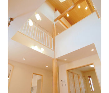 扉を開けると広がるのは3階まで吹き抜けの開放的なリビング。最上階まで回廊式のT様邸は、住宅というよりむしろ洗練されたコテージのような雰囲気です。